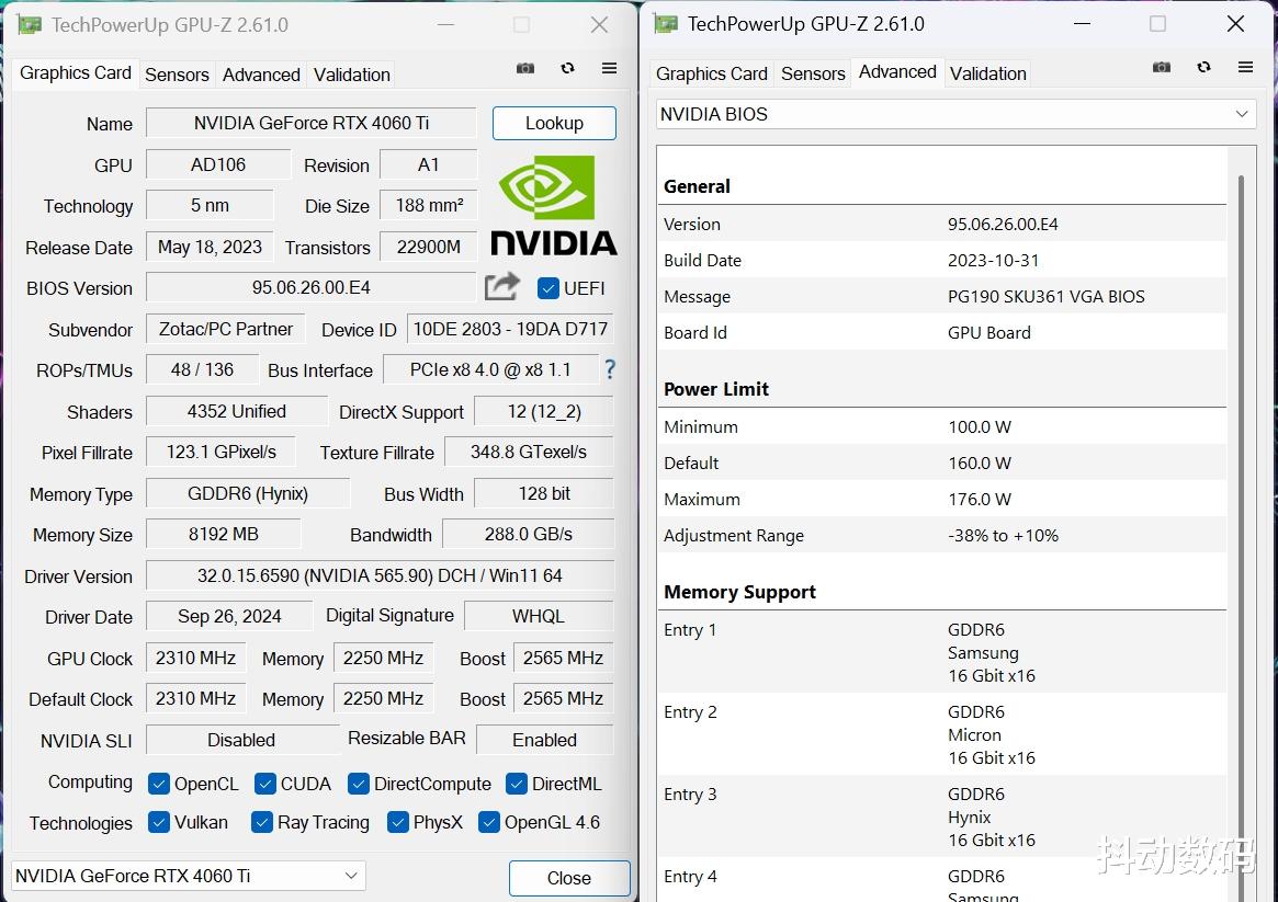 显卡的GPU-Z,RTX 4060Ti功耗160,OC可达176W。