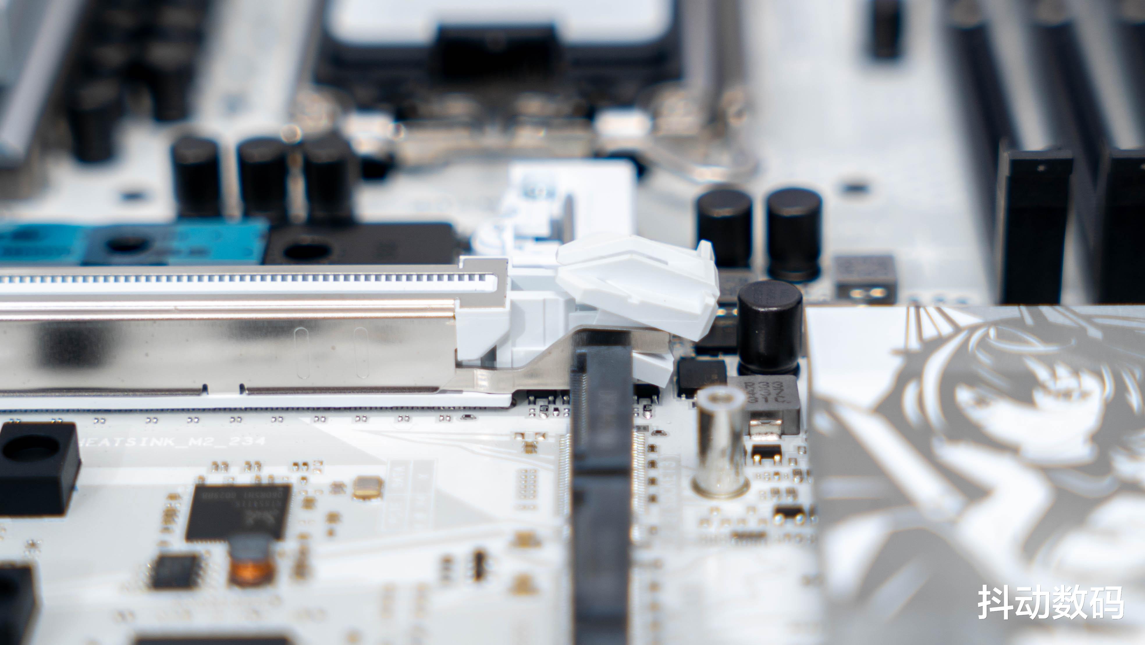 华硕 ROG STRIX B860-G GAMING WIFI S 小吹雪依旧是标注MATX板型设计,白色PCB的加入搭配银白色的散热装甲。M.2散热装甲模块上使用了更大面积的吹雪姬元素点缀。可以看到这次M.2 SSD的装甲部分这次扩展非常大。