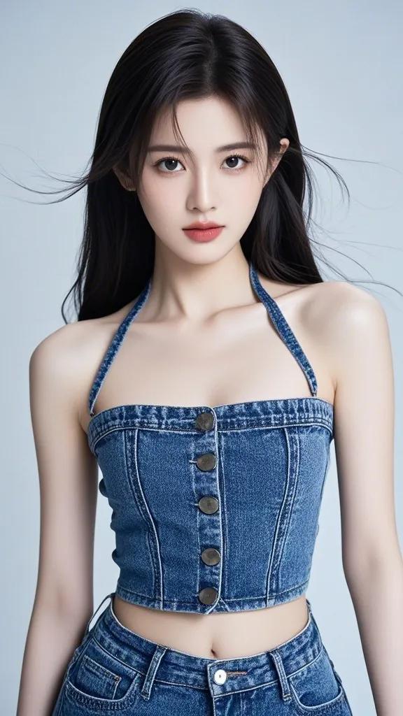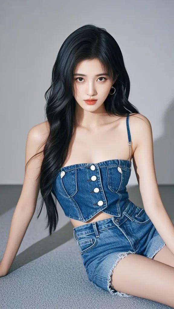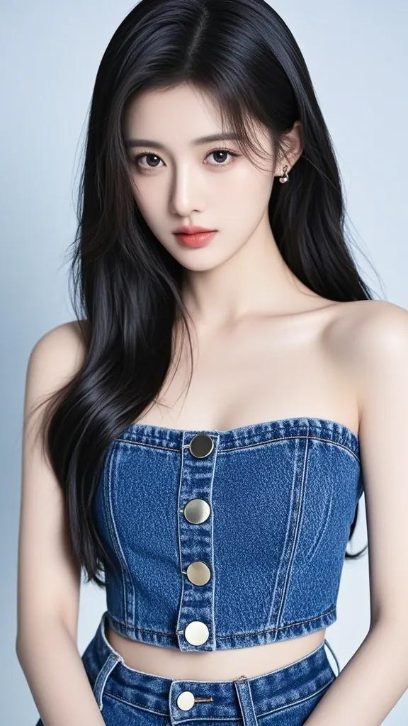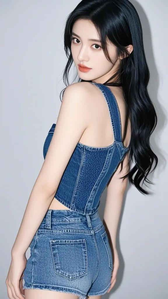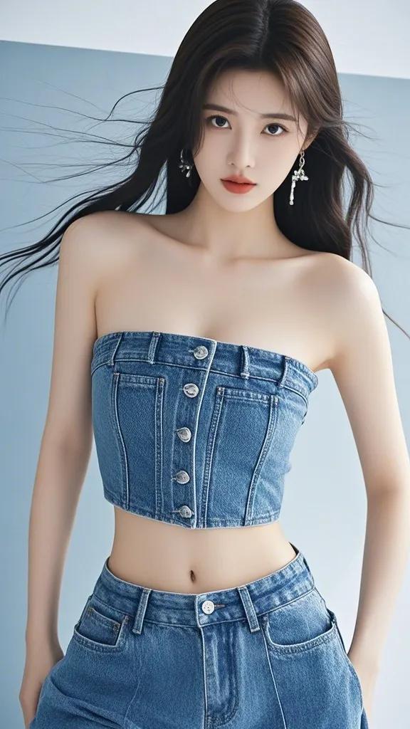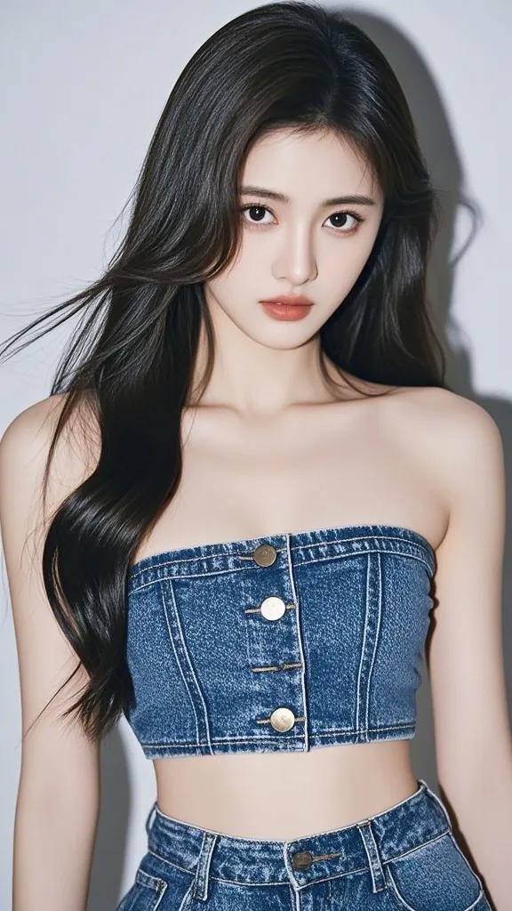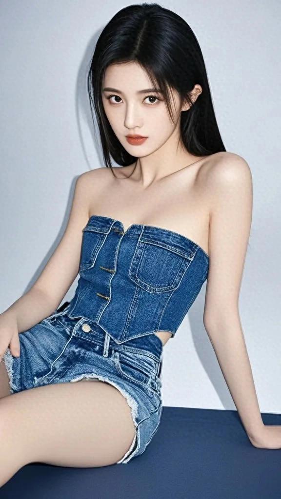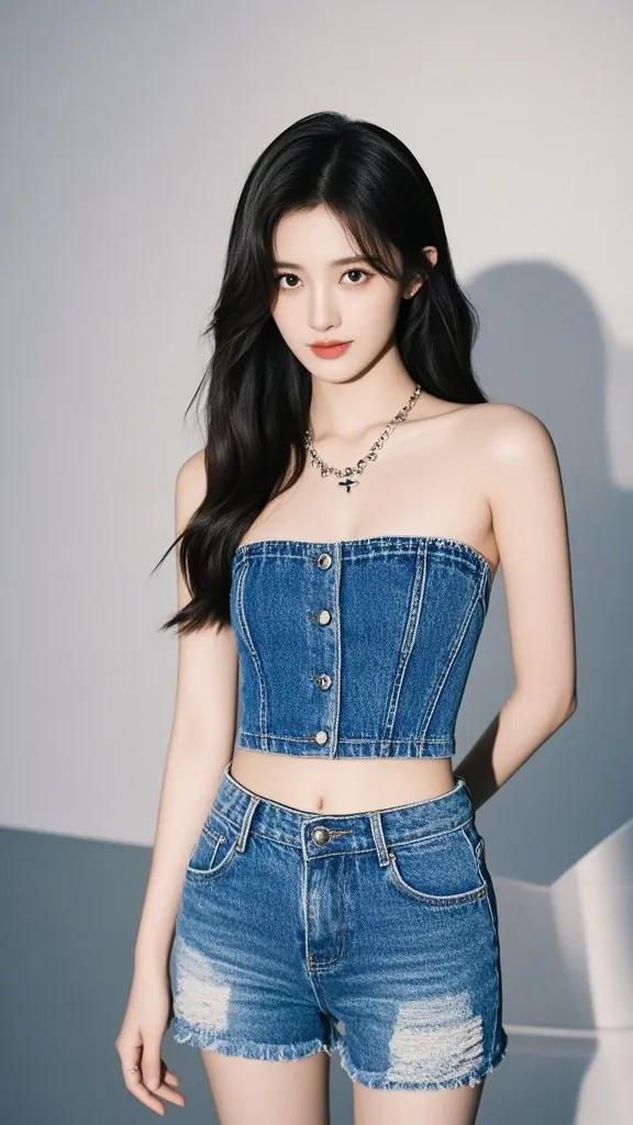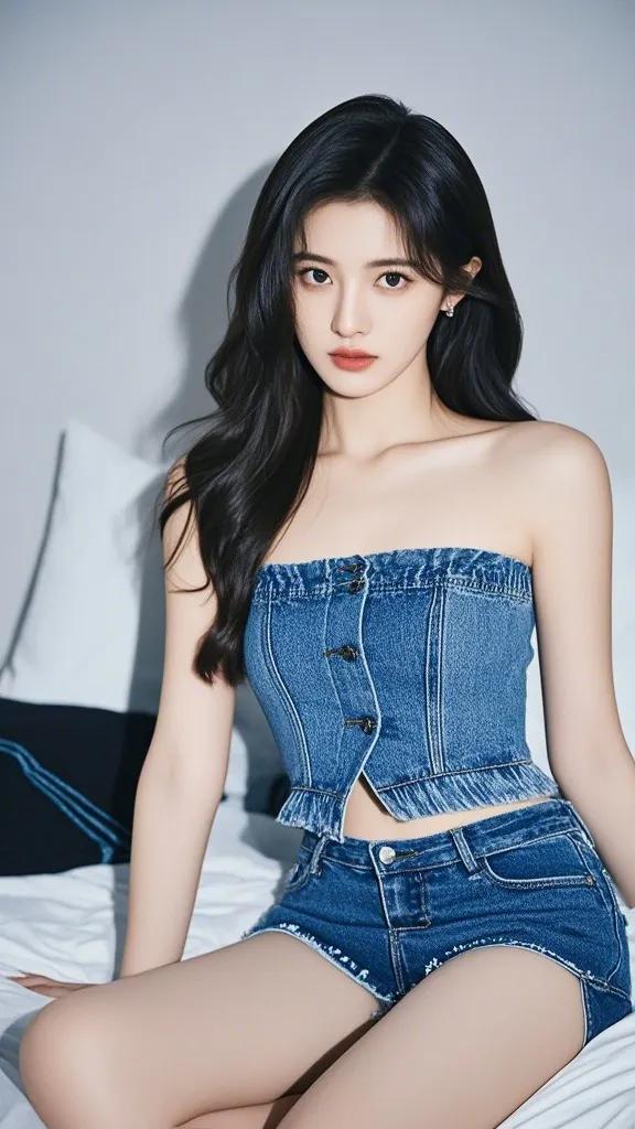 鞠婧祎,牛仔抹胸背心上衣,牛仔短裤AI版