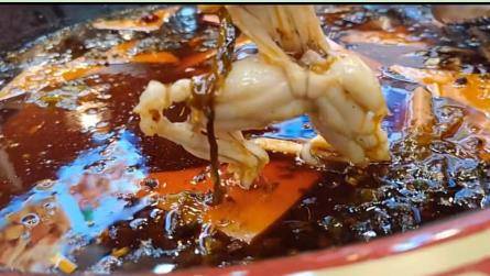 被捞起来的蛙,显而易见的晶莹剔透,包裹着一层鲜亮的红油,肉质是紧实弹牙,滋味是饱含了多重的麻和辣,想要细品几口,不料这一口早已滑入胃中。