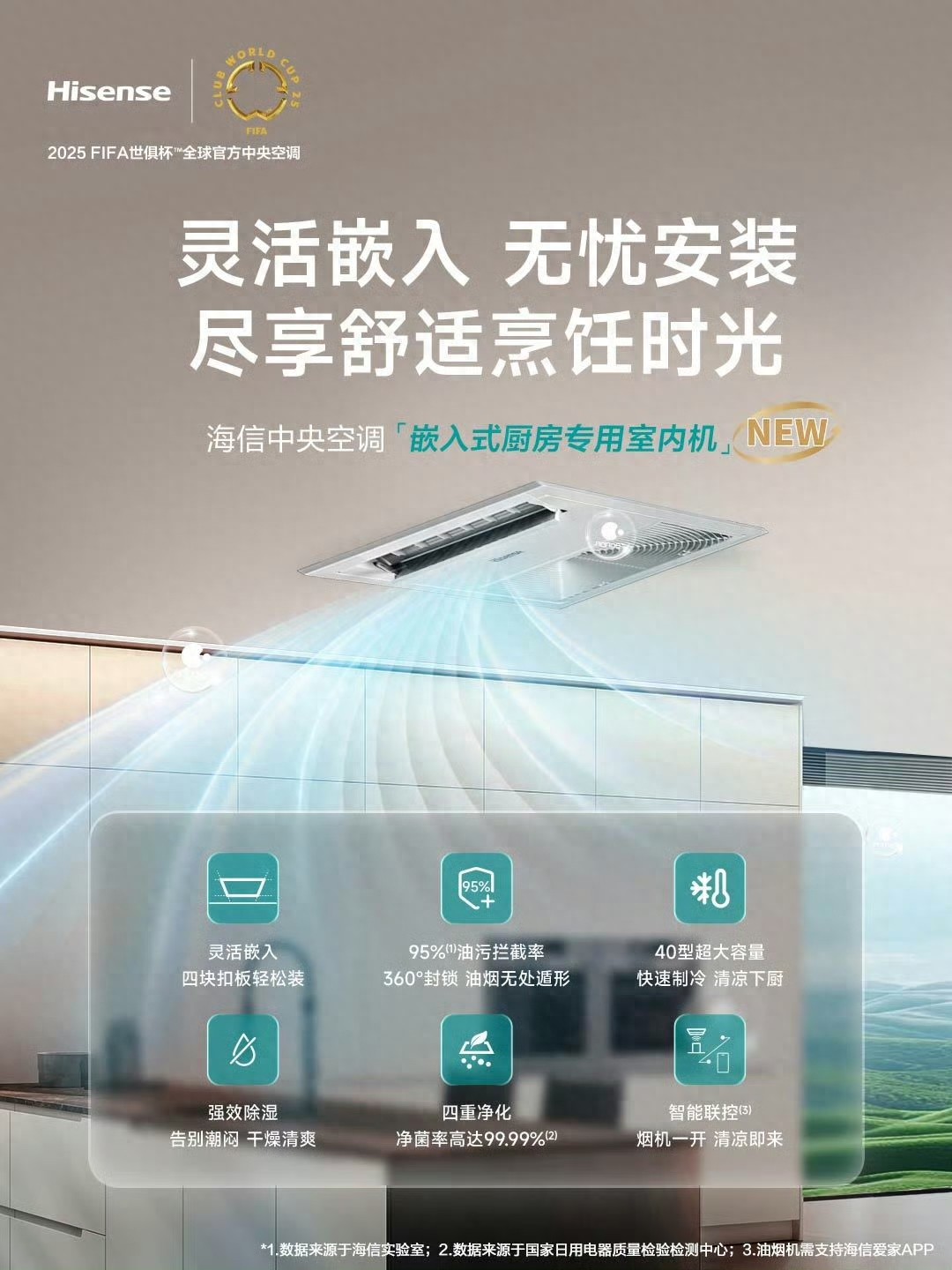 智能联控功能则体现了产品的人性化设计。与油烟机的联动,让用户无需繁琐操作,就能在烹饪时享受舒适的环境。海信中央空调的这款嵌入式厨房专用室内机,从安装到功能,全方位重塑了厨房的舒适感,是现代厨房的理想配置 。