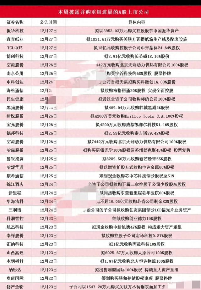 本周披露并购重组概念股一览表,投资有风险,入市需谨慎。