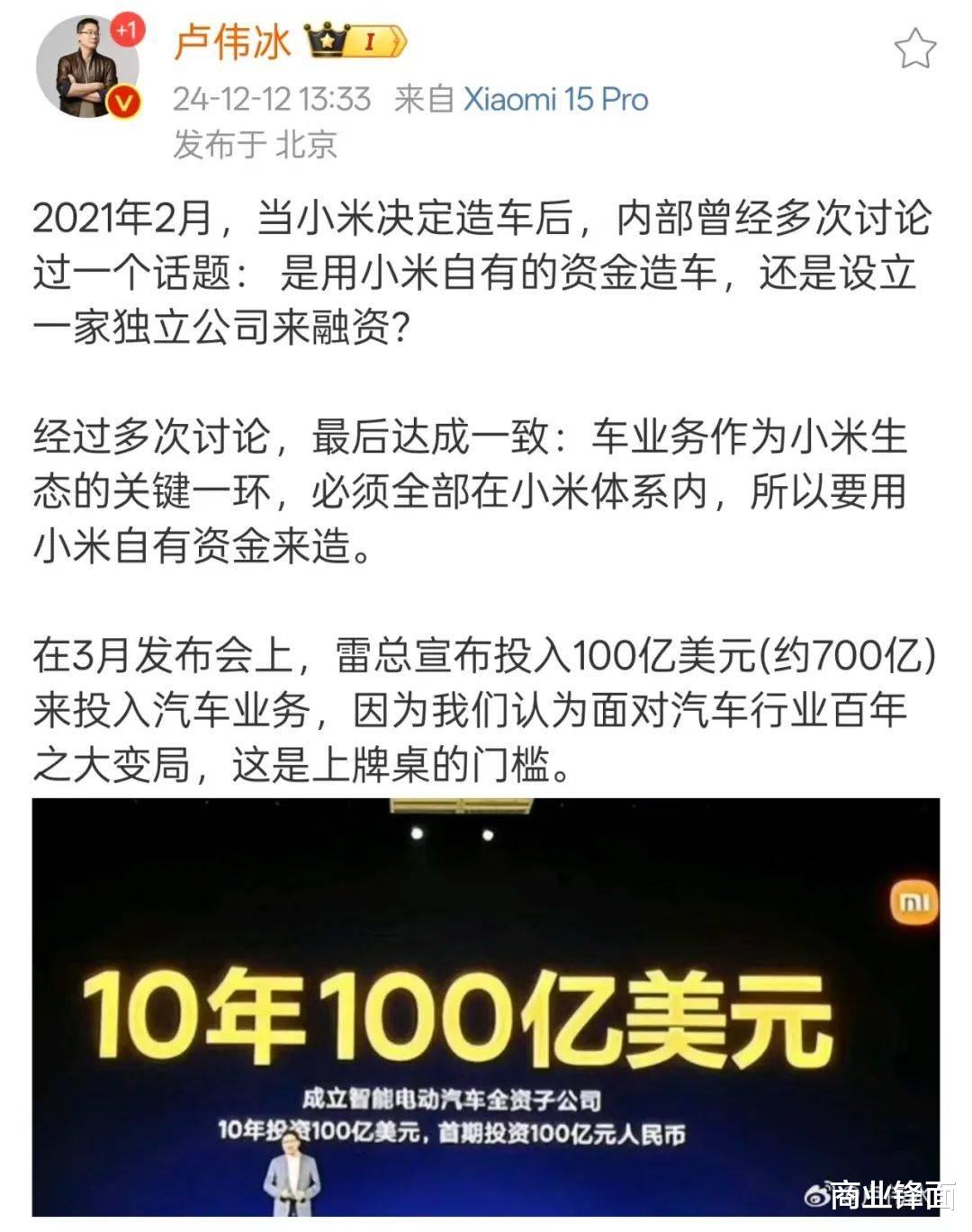小米汽车的崛起,不仅有破釜沉舟般的大手笔投入进行支撑,还将话语权牢牢掌握在小米自己手中。小米集团合伙人、总裁卢伟冰在12月12日有感而发:“车业务作为小米生态的关键一环,必须全部在小米体系内”“雷总宣布投入100亿美元(约700亿元人民币)来投入汽车业务。”
