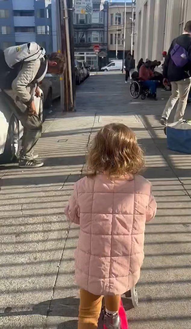 金发女童骑滑板车穿宽阔人行道,不远处一瘾君子因违禁品过量失神,前方亦有几位疑似瘾君子的无家可归者。