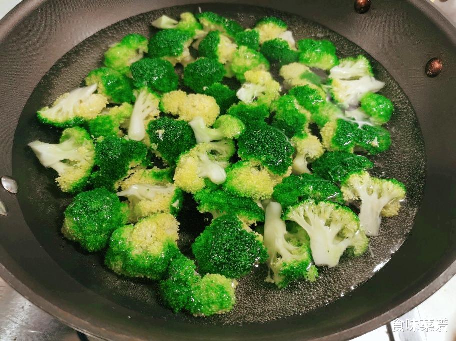 1、准备一朵新鲜的西兰花,摘洗干净,切成小朵,起锅烧水,水开加少许的食盐和植物油,这样保持西兰花原有的翠绿,放入西兰花,焯烫一会儿,捞出过凉控干水分。