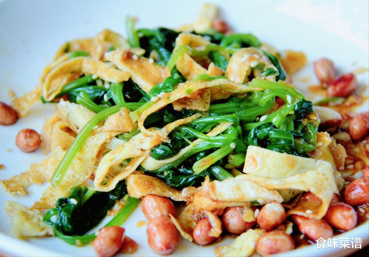 3、把鸡蛋丝和菠菜混合再一起,抓上一把炸花生米,调味放生抽、香醋、食盐和芝麻香油,搅拌均匀,即可上桌开吃,鲜香美味,低脂低热量,下酒下饭都可以。