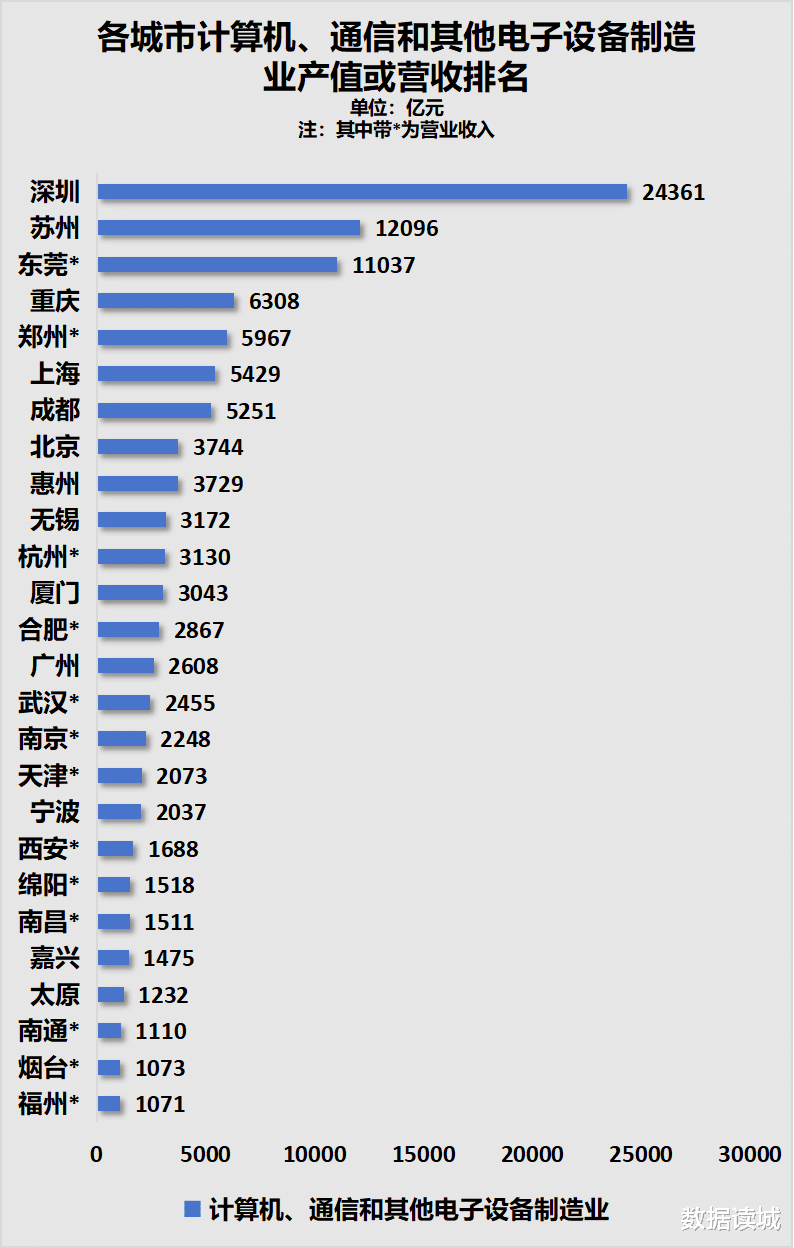 早在2021年,深圳的计算机、通讯和其他电子设备制造业产值就接近2.5万亿元,苏州和东莞在万亿元以上,超过5000亿元的城市还有重庆、郑州、上海和成都。有30个以上城市的计算机、通讯和其他电子设备制造业产值或营收超过千亿元,其中以万亿GDP城市为主,也有惠州、厦门、绵阳、南昌、嘉兴、太原等城市,这也代表了上述城市的产业硬实力或经济含金量。北京和上海可能比世人认知中的要低一些,但京沪更有全面性,在软件方面也处于领跑位置。