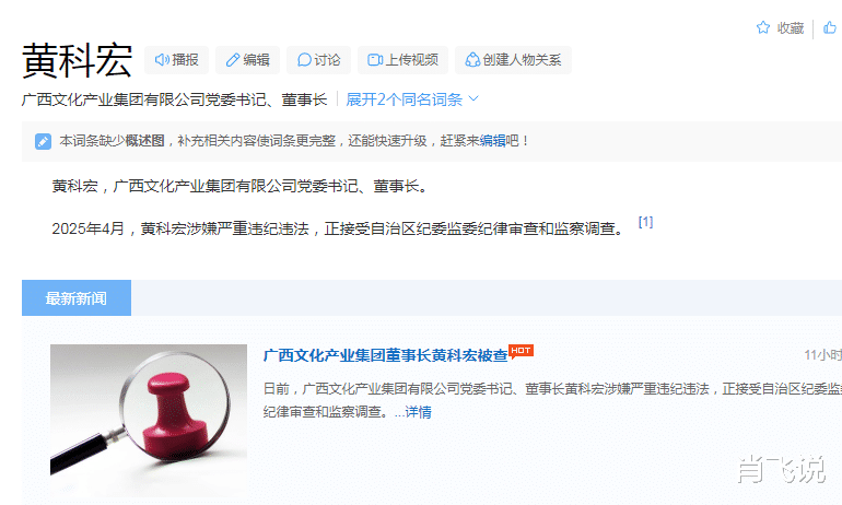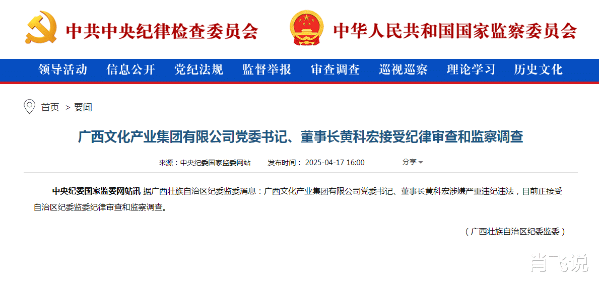 广西纪委4月18日消息,广西文化产业集团公司董事长黄科宏涉嫌严重违纪违法被查。
