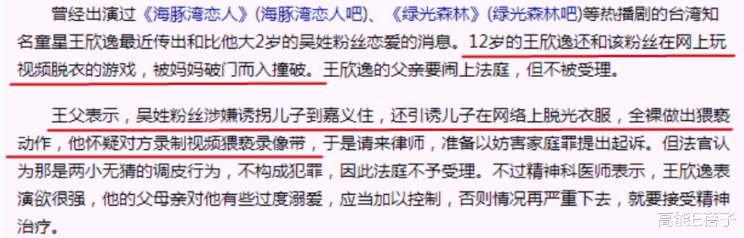 他在网上跟女粉丝玩L聊,被妈妈撞见,爸爸把女粉丝告上法庭。当时有精神科医生劝过,王欣逸的表演欲很强,要加以控制,如果放任下去可能要接受精神治疗。