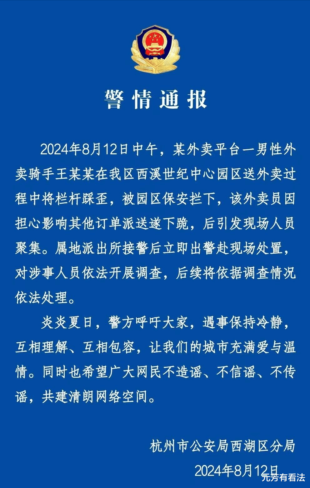 8月13日,杭州市公安局西湖区分局发布通报,对情况进行回应称:2024年8月12日中午,某外卖平台一男性外卖骑手王某某在我区西溪世纪中心园区送外卖过程中将栏杆踩歪,被园区保安拦下,该外卖员因担心影响其他订单派送遂下跪,后引发现场人员聚集。属地派出所接警后立即出警赴现场处置对涉事人员依法开展调查,后续将依据调查情况依法处理。
