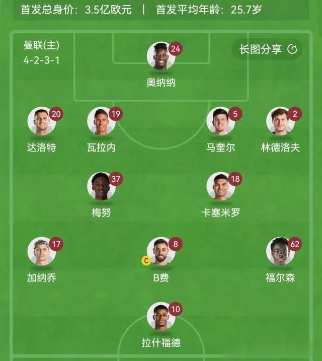在本场比赛中,滕哈赫为曼联安排了 4-2-3-1 的阵型。拉什福德独自顶在最前面,加纳乔、B 费和首次代表曼联一线队先发的 19 岁小将富尔森在他身后,梅努和卡塞米罗担任双后腰。后防线上,马奎尔和瓦拉内镇守中路,林德洛夫和达洛特分别负责两个边路的防守。门将位置上由奥纳纳担任。