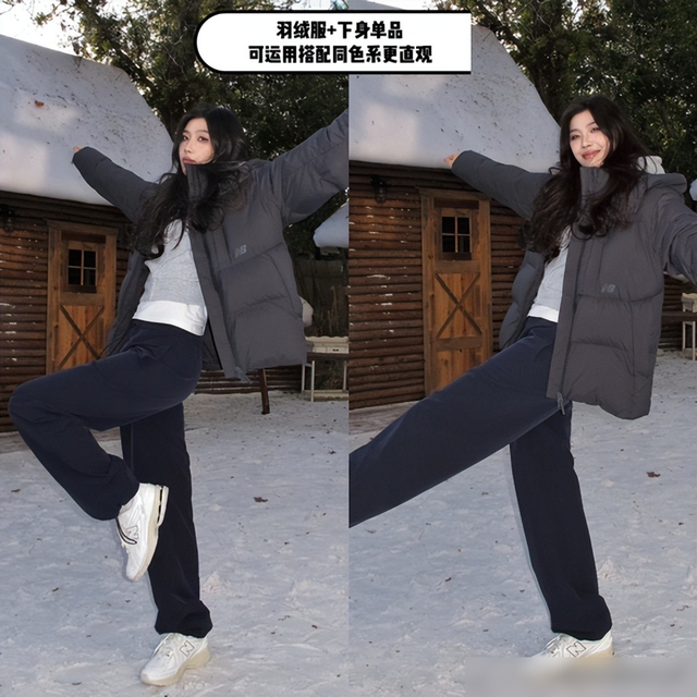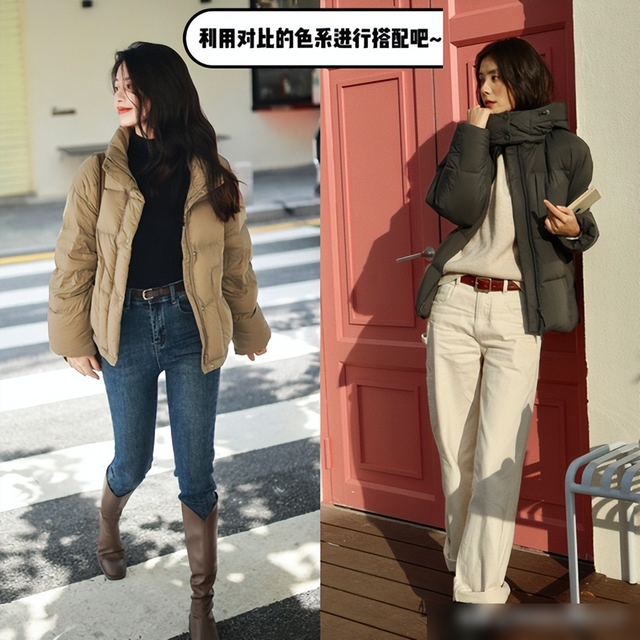 对于短款羽绒服,我们可以选择搭配宽松下装, 增加整体的层次感。同时,我们还可以利用 oversize的羽绒服与紧身裤、打底裤等单品进行搭配,打造出时尚的对比感。