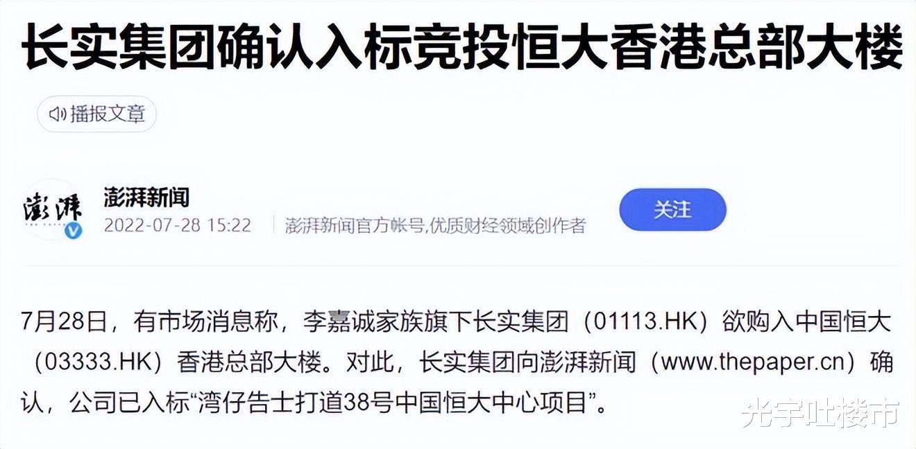 李嘉诚将投资重心转向国内房地产?据澎湃新闻报道,李嘉诚旗下的长江实业集团确认,已入标“湾仔告士打道38号中国恒大中心项目”。去年8月,市场传言,恒大作价105亿港元差点卖掉。如今市场估值约90亿港元。所以,李嘉诚是不是会捡漏呢?