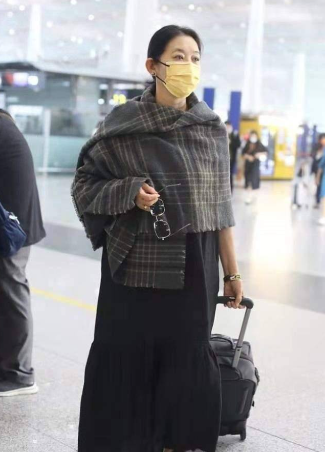 倪萍这次走机场选择了一条黑色宽松连衣裙,巧搭灰色格纹披肩,不仅丰富了视觉效果,有效地摆脱了黑色可能带来暗沉老气感,还也为造型增添了一份柔美和优雅,同时,黑色和灰色既丰富了层次感,有效打破了黑色的沉闷感,同时经典又耐看,非常适合成熟的中老年女性。