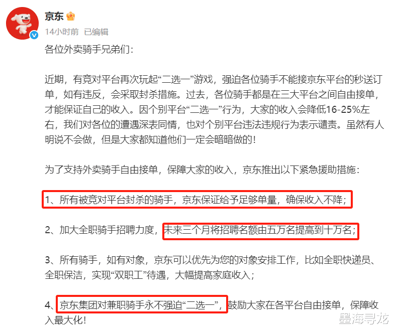 如果说刘强东的“真人秀”是流量密码,那么京东外卖的“组合拳”才是真正的行业核弹。在京东发布的公告中:京东将逐步为京东外卖全职骑手缴纳五险一金。但是这一项就令各大同行望尘莫及。