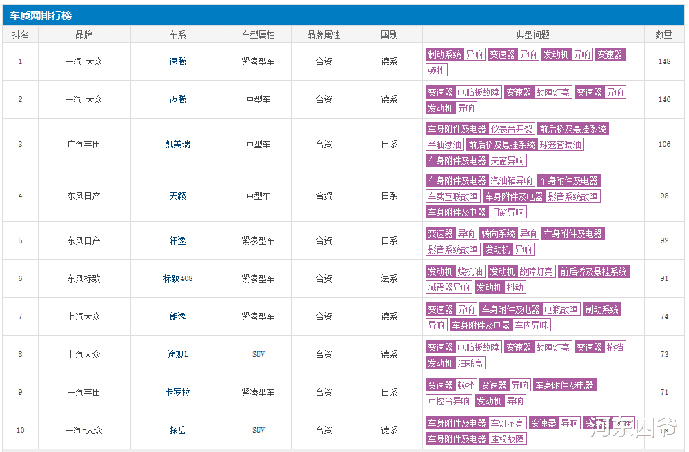 从排行榜前十来看,不出所料都是合资品牌车型,而且大多都是老面孔。其中大众汽车占据半壁江山,日系车型丰田凯美瑞、日产天籁、日产轩逸、丰田卡罗拉纷纷上榜,法系标致408这颗“常青树”,稳居投诉排行榜前十中。