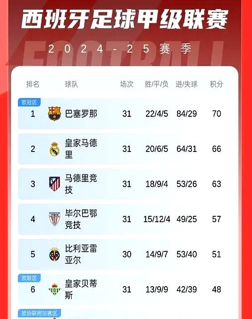 更关键的是,毕尔巴鄂竞技现在西甲排第四,领先第六名9分,联赛还剩7轮,想掉出前五,除非他们自己作死。