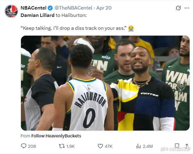 这场G2最后时刻步行者已经锁定胜局了,哈利伯顿挑衅利拉德,哈利伯顿还比了一个戴表的动作来嘲讽利拉德。