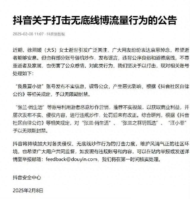 近日,抖音平台发布了一则公告,宣布对张兰及其儿子汪小菲的抖音账号实施无限期封禁,此举在社交媒体上引发了广泛关注。封禁的原因,是他们涉嫌利用已故明星大S进行恶意炒作。