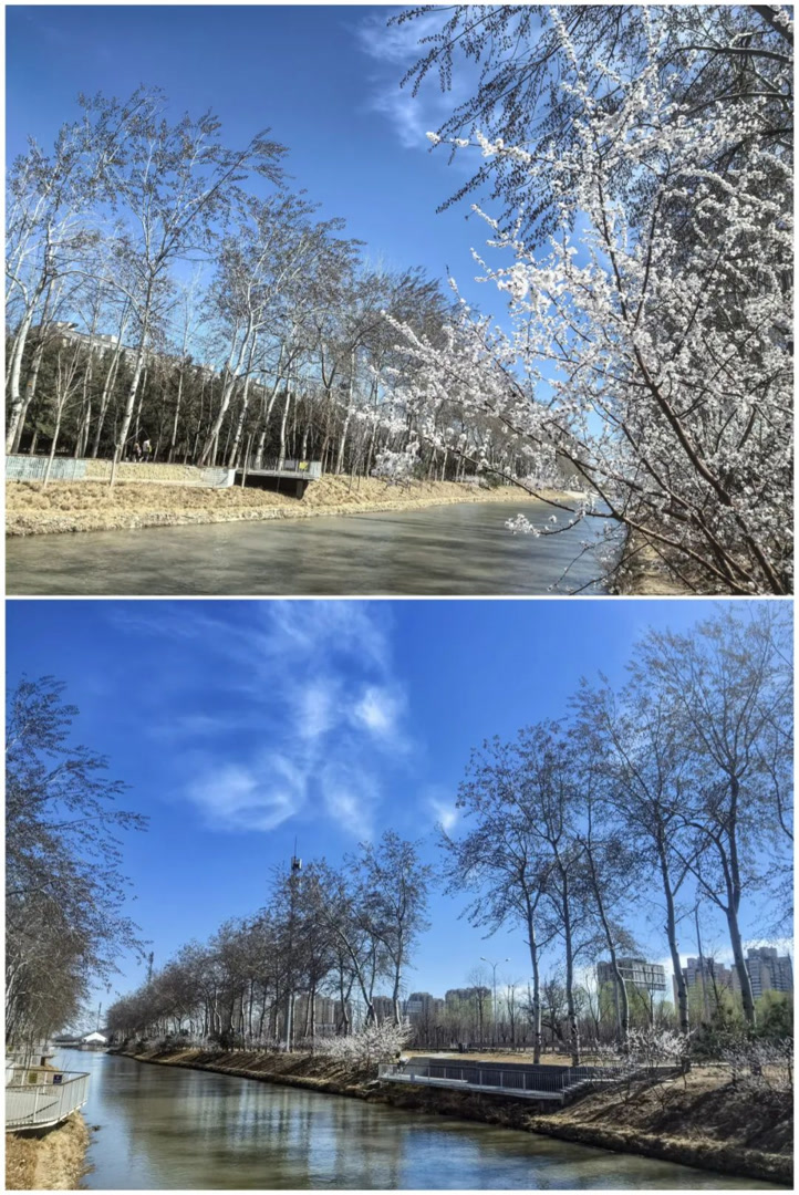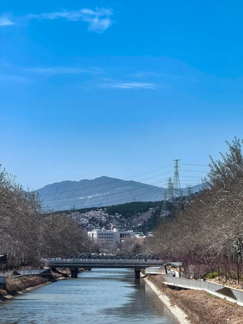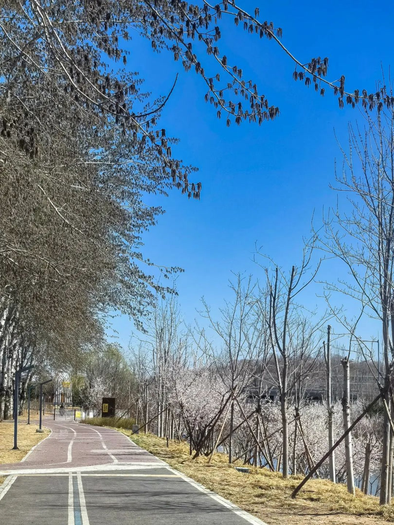 目前山桃争相开放,搭配蓝天白云氛围感拉满~沿河岸绵延几公里,人少景美,随手拍都是电影感!