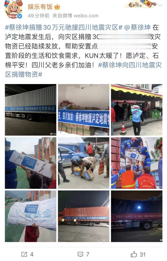 在地震发生后,蔡徐坤向灾区捐赠了30万元善款,帮助安置点受灾群众满足过度安置阶段的生活和饮食需求。