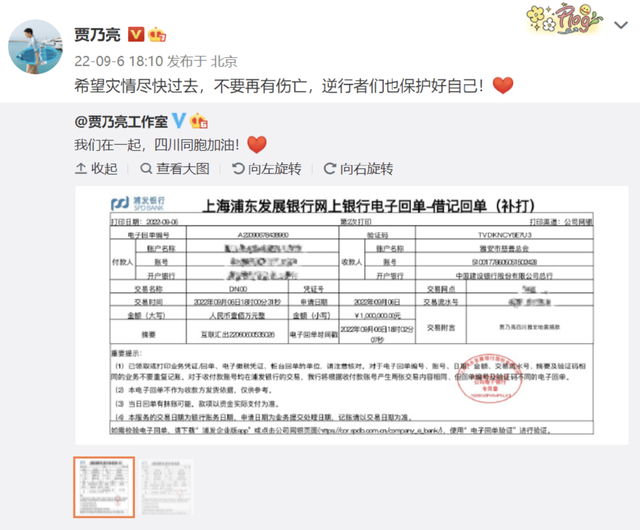罗云熙算得上是新生代艺人,他在9月6日晚也晒出了一张银行转账单截图,转给雅安红十字会50万元。