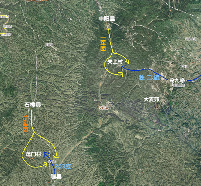 同时又命令中阳关上村的孙楚第四纵队,驻守隰县的杨澄源第一纵队,向红军侧翼进击,企图威胁红军后路。如下图