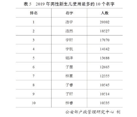 2019男性新生儿使用最多10个名字依次为:浩宇、浩然、宇轩、宇航、铭泽、子墨、梓豪、子睿、子轩、梓睿。与2018年相比,铭泽、子墨、子睿、梓睿进入前十。