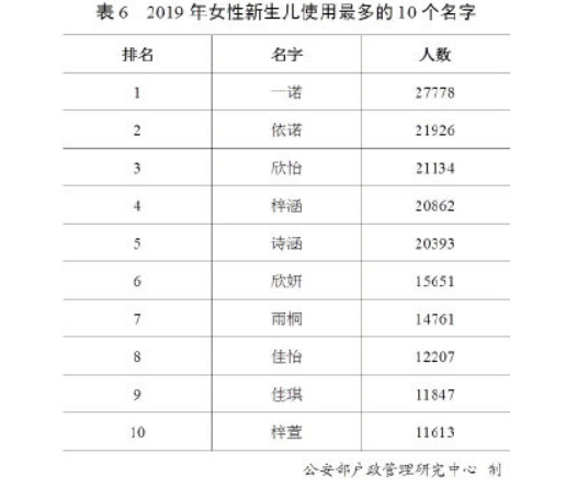 2019女性新生儿使用最多10个名字依次为:一诺、依诺、欣怡、梓涵、诗涵、欣妍、雨桐、佳怡、佳琪、梓萱。与2018年相比,佳琪进入前十。