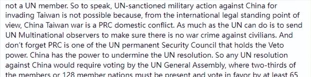 从国际法律角度来看,台海战争是中国内政,联合国所能做的最多是派遣联合国多国观察员,以确保没有针对平民的战争罪,不要忘记,中国是拥有否决权的联合国安理会常任理事国之一。