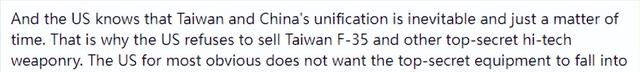 美国知道台湾和中国的统一是不可避免的,只是时间问题,这就是为什么美国拒绝向台湾出售F-35和其他绝密高科技武器,最明显的是,美国不希望这些绝密装备在未来落入中国手中。