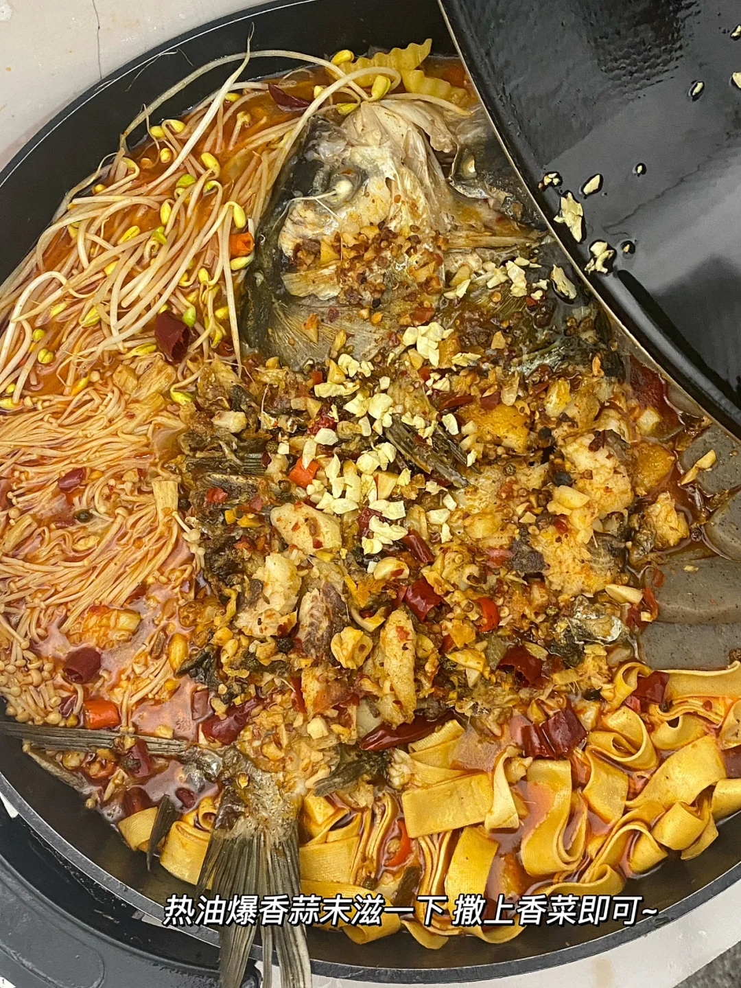 最后淋上热油爆香蒜末就可以了,撒上香菜可以开放了,家庭版的烤鱼省钱又卫生,看着就很有食欲。