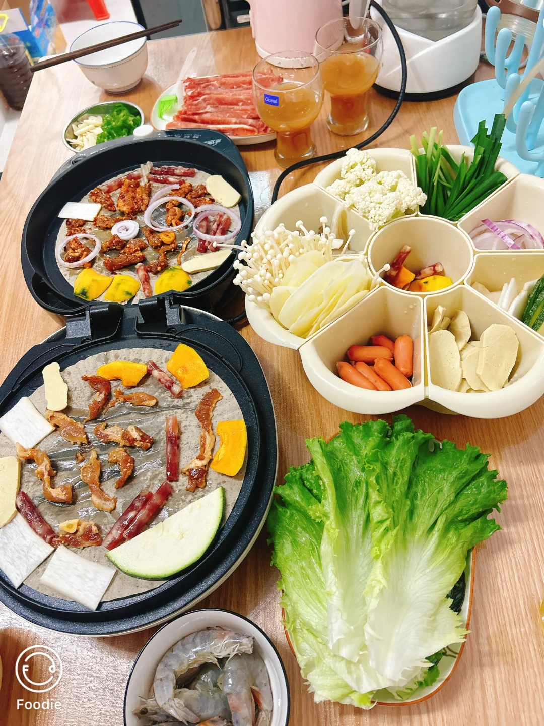准备好要吃的食材,电饼铛放在中间就开始烤吧,家如果你觉得难清洗,就在上面铺一层油纸,再将食材放在上面就行了,完美!