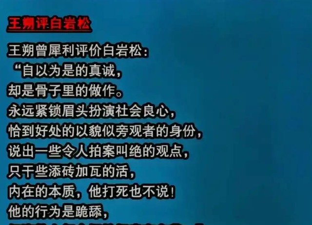 俗话说“流氓不可怕,就怕流氓有文化”,王朔除了口嗨白岩松是“肉喇叭”之外,还犀利地点评其“自以为是的真诚,却是骨子里的做作”,“他的行为是跪舔,但姿势上却拿捏的相当有自尊”,“只干些添砖加瓦的活,内在的本质,他打死也不说”。