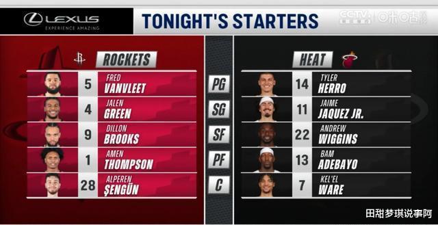 火箭队本场派出的先发五虎为:5号范弗利特、4号杰伦·格林,搭配9号狄龙、1号阿门及28号申京