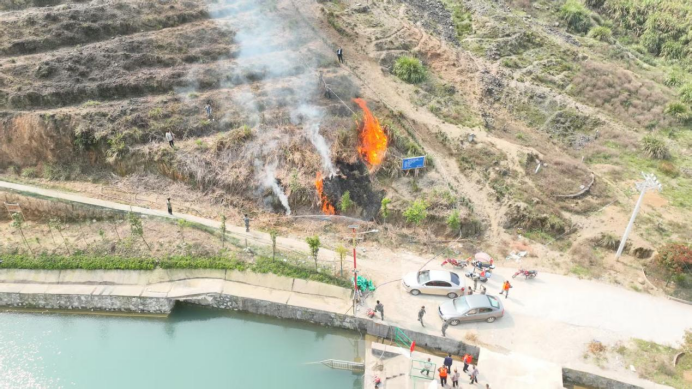 演练模拟东桥村东江湖边突发森林火灾,火势迅速蔓延,情况十分危急。东桥村护林员发现火情后,第一时间向镇应急办报告。接报后,镇应急办立即启动森林火灾应急预案,集结专职消防队赶赴现场。