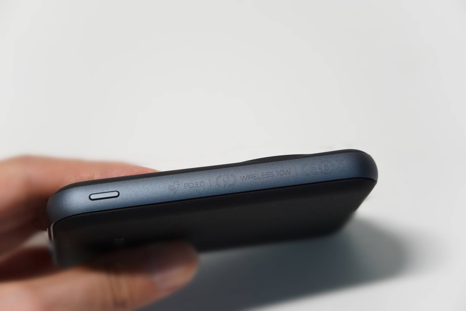 ▼摩米士迷你磁吸充电宝边框采用铝合金打造,电源键位于侧部,PD3.0标识说明充电宝支持PD3.0快速充电协议