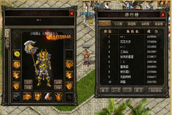 点开区服排行榜发现新增加了战力榜和装备榜,原来 vv丶这位大神是区服战力榜排名第一位,个人榜排名第一位等级510级是目前区服最高级别,英雄总排行第一位,等级318级,相对其它玩家的等级是碾压式的存在,怪不得进入游戏就能看到这位大神的名字,原来如此。点开人物画面看到是区服第一行位沙城霸主的行会负责人,果然是名符其实的牛人。