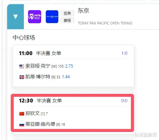 这场时间也出来了,那就是明天中午12点30分,这个时间对郑钦文来说,确实是一个考验,明天又得早起来准备这场比赛了,加上今天三盘的消耗,不知道明天郑钦文的体能,会不会受到影响呢?