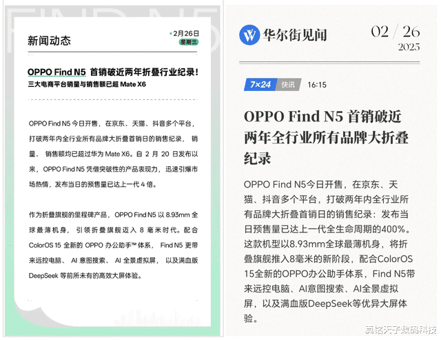 1、Find N5 首销火爆,打破行业纪录像OPPO在2月20日发布的 OPPO Find N5,在开售之日便展现出了惊人的市场号召力。在京东、天猫、抖音等多个主流电商平台,Find N5 成功打破了近两年内全行业所有品牌大折叠首销日的销售纪录,其销量和销售额均超过了华为 Mate X6。自发布以来,Find N5 凭借突破性的产品表现力,迅速点燃了市场热情,发布当日的预售量就已达到上一代全生命周期的 4 倍。