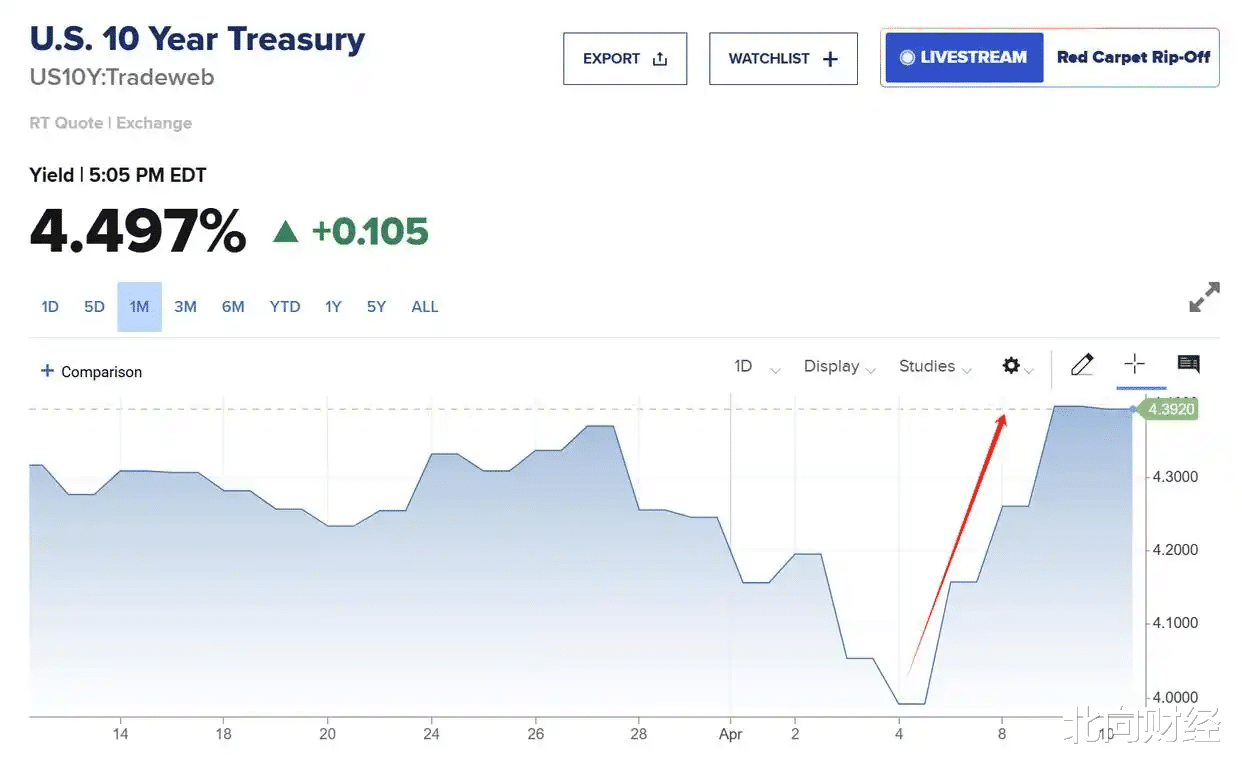 就在美股史诗级暴跌的同时,美债收益率也在连日上升,30年期美债收益率一度飙至5.4%,10年期美债收益率突破4.5%。