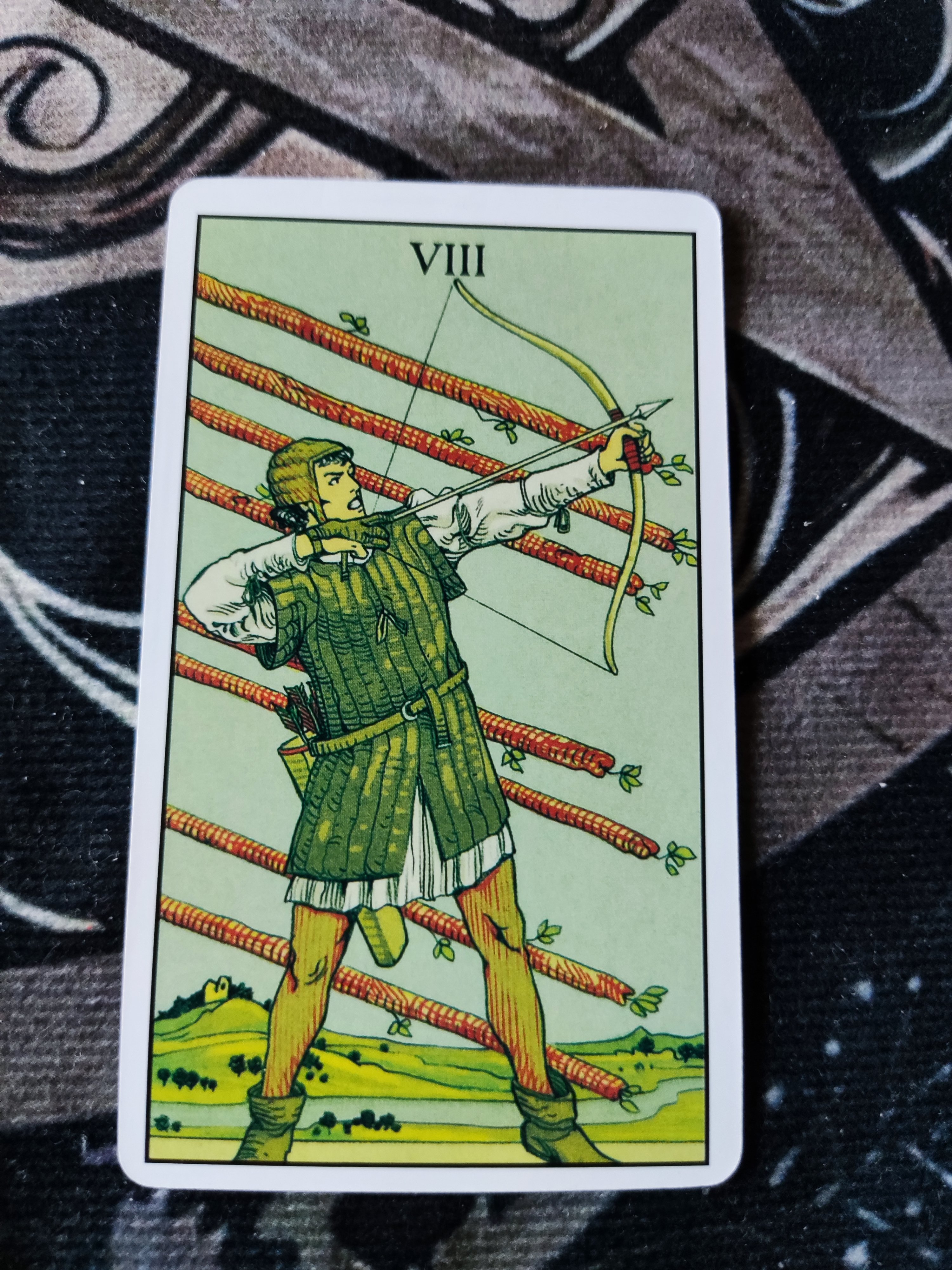 【故事与简单牌义】权杖八描绘八根权杖如离弦之箭划破长空,飞越山川河流。瑞秋·波拉克在《78度的智慧》中指出,这是"火元素能量的终极释放",象征"计划从酝酿到爆发的临界点"。LUA在《塔罗解牌研究所》中强调,权杖的平行轨迹暗示"集体行动力的协同效应",而河流的蜿蜒则揭示"快速行动需顺应自然节奏"。丹尼尔在《塔罗逆位精解》中补充,逆位时散乱的权杖警示"当速度脱离目标,效率即沦为混乱"。向日葵《塔罗葵花宝典》通过画面色彩解读:"炽热的红需以冷静的蓝为衬,方能避免能量焚毁"。