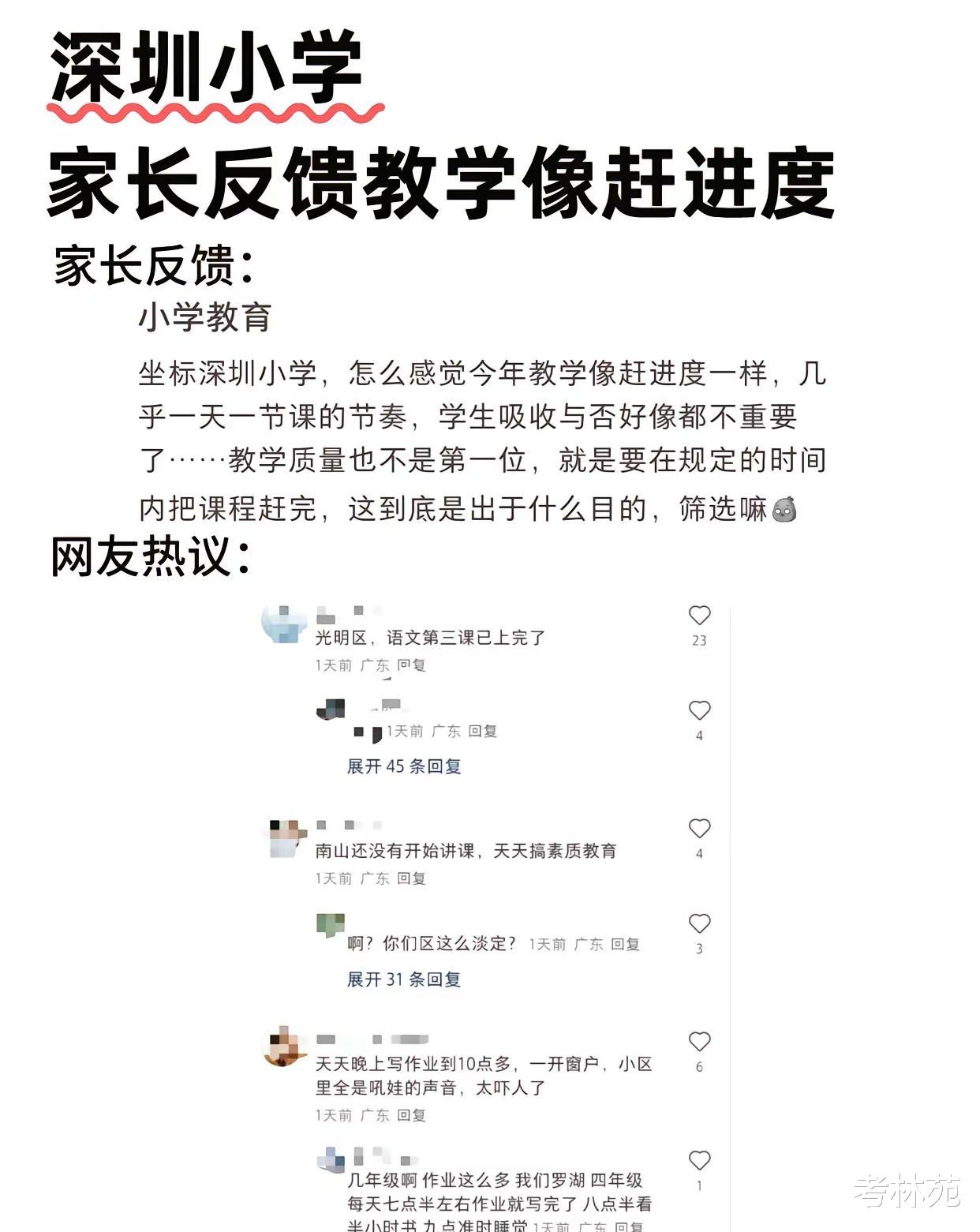 这不,有深圳的小学家长在网络平台上反馈称,今年的教学就像赶进度一样,几乎一天一节课的节奏,老师也不管学生是否吸收了,只为了在规定的时间内把课程赶完。所以他(她)质疑,这样的目的是什么,教学质量都不要了吗?