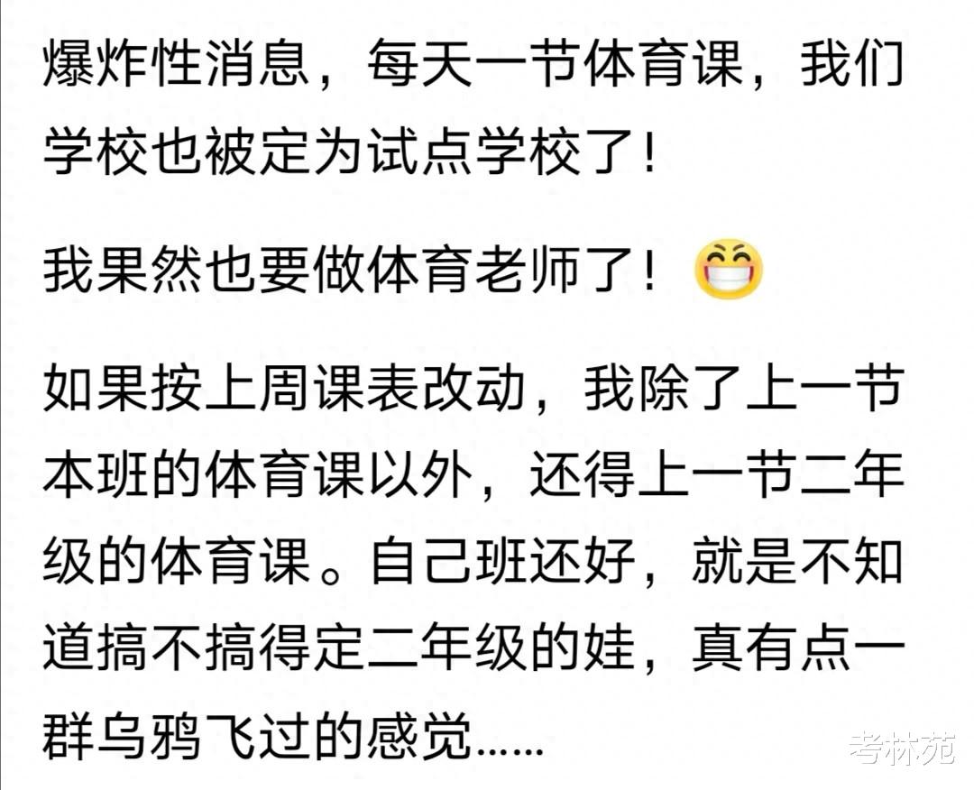 这段时间,有很多语文、数学、英语老师都在社交平台上吐槽,称今年开学后,学校实行15分钟大课间、一天一节体育课,为了避免出乱子,学校要求所有老师轮流课间“盯梢”,又由于体育老师不够,还要兼做体育老师,工作负担陡增。甚至有一些老师反馈称,除了要兼任体育老师外,语数英老师很可能要兼任综合实践活动、劳动和道德法治等课程的老师,简直是太忙了,都不知道自己的真正身份到底是哪个科目的老师。