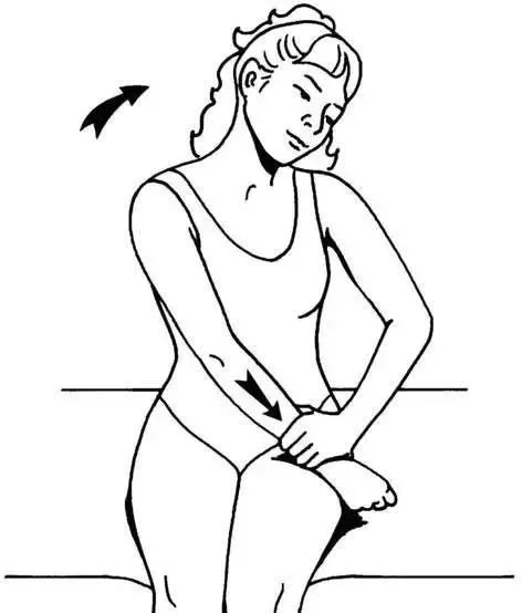 在腕上部抓住手臂向下和对侧牵拉,将头部向同侧轻轻的倾斜维持3秒钟,重复10次。