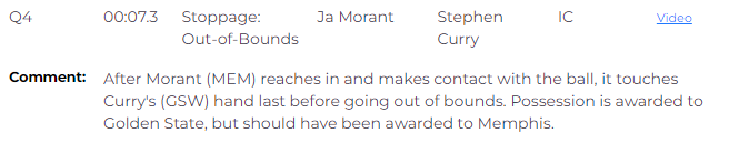 第四位误判,比赛还剩7.3秒,勇士117-116领先1分,莫兰特伸出手并与球接触后,球最后碰到了库里的手,然后才出界外,当时勇士队获得了球权,但球权本该属于灰熊,这一次错判是灰熊吃亏。