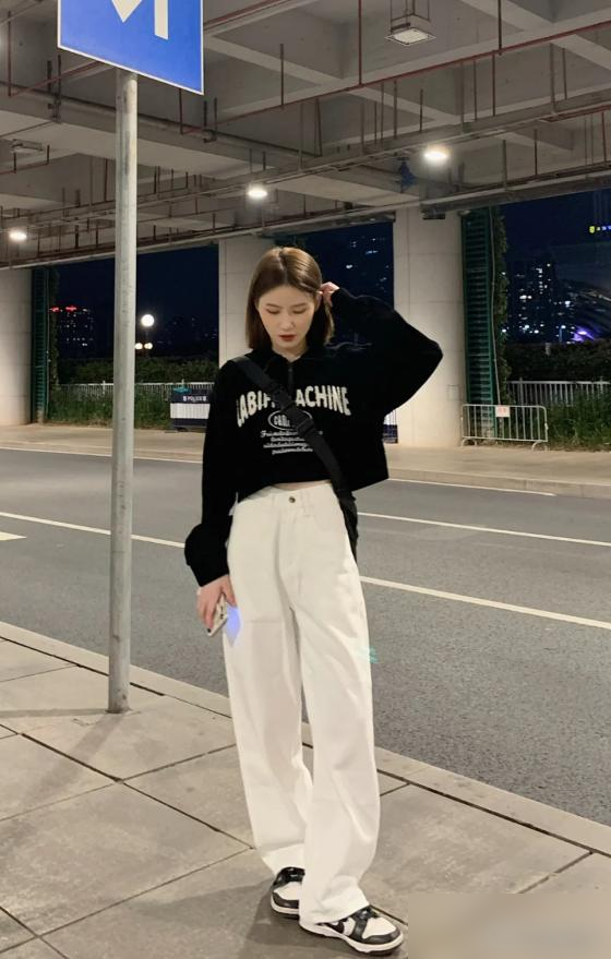 在搭配短款卫衣的时候,拖地裤也会起到非常重要的作用,形成上短下长的效果,将整体视觉重心上移,不仅显得显高显瘦,同时也会有一种飘飘欲仙的效果,十分吸引眼球。