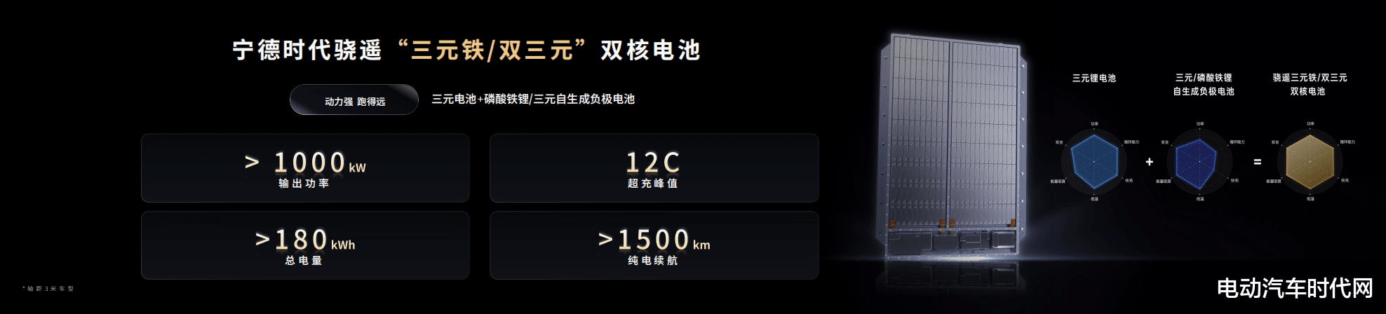 三元铁/双三元双核电池:三元电池+磷酸铁锂自生成负极电池,主能量区三元电池充电倍率峰值可达12C,能提供超1兆瓦的强劲动力,当电量低至20%时仍可输出超600KW的功率;由三元电池+三元自生成负极电池搭配的升级版产品——骁遥“双三元”双核电池,在轴距3米的轿车上配电量可突破180度,纯电续航里程突破1500公里。