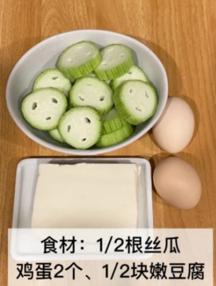 主要食材:选购一根新鲜的丝瓜(丝瓜是女性朋友最爱的蔬菜,维生素含量高,口感非常清甜多汁,丝瓜能够搭配鸡蛋和肉类一起吃,帮助肌肤补水,延缓肌肤的衰老。记得要挑选表皮光滑,色泽嫩绿的,新鲜的丝瓜水分多,是这道菜肴的标配),一大块嫩豆腐或者内酯豆腐,冷水少许,开水适量,土鸡蛋两枚,少许食用油,半勺白醋,几片生姜,食盐若干,白胡椒粉半勺,小葱三根,其他调味品。