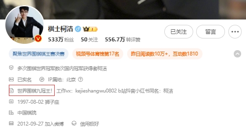 1月23日, 在今天富有争议性的LG杯决赛中,柯洁不满判罚选择退赛,无缘九冠王。但在赛后,有网友发现柯洁更新了自己的社媒简介,加上了“世界围棋九冠王!”。在今天的决胜盘比赛途中,柯洁将两颗提子放在了棋盒外面,韩国裁判此时暂停比赛,柯洁对裁判中止比赛的时间和方式提出异议,一度起身直接质问裁判“你怎么能这么干呢”。此后比赛中断超过两个小时。最终官方表示:因为柯洁提子没有放到棋盒盖,正常判罚两目,在协商后柯洁提出重赛,韩国棋院不接受重赛,柯洁选择退赛!卞相壹最终夺冠 。在此前的两盘比赛中,柯洁在第一盘执黑以2.5目战胜卞相壹,第二盘柯洁因两次提子未放入棋盒盖内被判负。